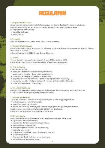 Prace konkursowe należy dostarczyć do biblioteki Szkoły Podstawowej im. Komisji Edukacji Narodowej w Zaborzu (ul. Jezioro 2) do dnia 8 maja 2026 r. do godz. 14:30.