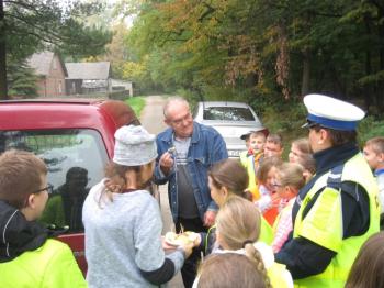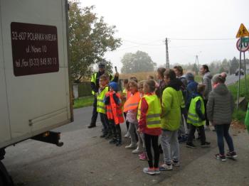 Byli to uczniowie IV klasy Szkoły Podstawowej w Porębie Wielkiej, która to bierze udział w małopolskim konkursie „Odblaskowa szkoła”. Wraz z policjantami z Komendy Powiatowej Policji w Oświęcimiu zatrzymywali przejeżdżające samochody.