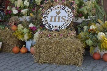Pierwsza część Święta Plonów rozpoczęła się od uroczystej mszy świętej polowej koncelebrowanej, której przewodniczył ks. Arkadiusz Bąk. Część oficjalną otworzył sołtys Harmeż Adam Zieliński, który powitał wszystkich przybyłych na uroczystość.