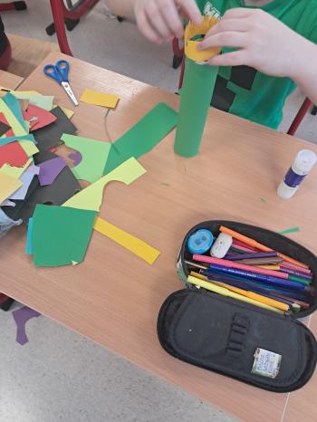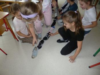 Dodatkowo dzieci wykonały pracę plastyczną „Zaczarowane buty” z wykorzystaniem rolek po ręcznikach papierowych oraz kolorowego papieru. Powstały kreatywne, barwne i pomysłowe prace, które wprowadziły wszystkich w magiczny andrzejkowy nastrój. Andrzejkowe spotkanie w świetlicy było pełne uśmiechu, radości i dobrej zabawy, pozostawiając uczniów w wyjątkowym nastroju i z nadzieją na spełnienie najpiękniejszych wróżb.