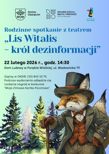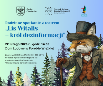 Zapraszamy na wyjątkowe wydarzenie dla dzieci i ich opiekunów! W niedzielę, 22 lutego, na scenie w Domu Ludowym w Porębie Wielkiej zobaczycie spektakl teatralny „Lis Witalis – Król dezinformacji”, w wykonaniu Krakowskiego Teatru Bajki, skierowany do dzieci w wieku od 5 do 12 lat. To mądra i angażująca opowieść, z której także starsi widzowie wyniosą coś wartościowego.