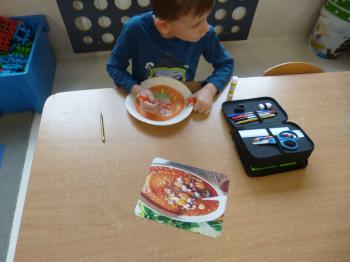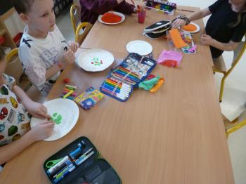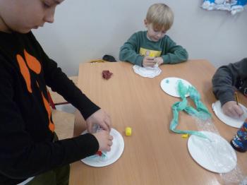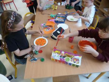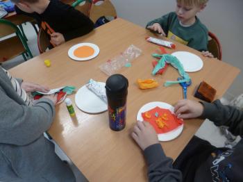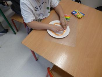 Następnie dzieci przystąpiły do pracy plastycznej – każde z nich wykonało wybrane przez siebie danie hiszpańskie, wykorzystując talerzyki papierowe, kolorowy papier, bibułę, farby, papierowe serwetki oraz plastelinę. Powstały kolorowe i pomysłowe prace, które ozdobiły gazetkę świetlicową i stały się atrakcyjną dekoracją sali.